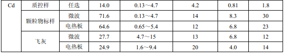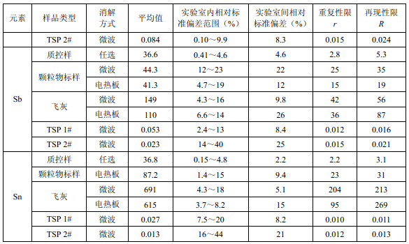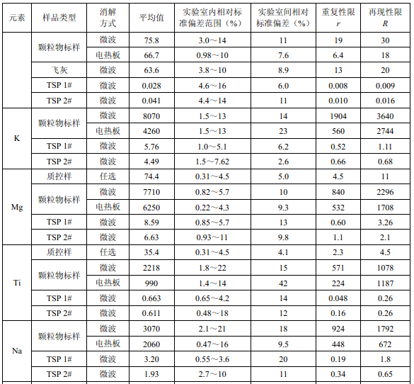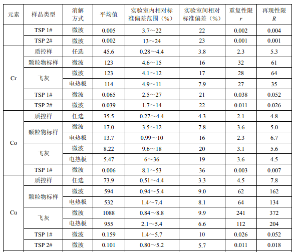7家實驗室分別對統一提供的大氣顆粒物標樣、濾膜質控樣品、飛灰樣品(廢氣顆粒物模擬樣品)和2 個顆粒物負載量不同的TSP 樣品,同時取6 份平行樣品分別進行微波消解 (7.2.1.1 )和電熱板消解(7.2.1.2 ),用等離子體發射光譜法測量。對測定結果進行數理統 計,得到方法的精密度(各元素測定值的實驗室內標準偏差范圍、實驗室間標準偏差、重復 性限和再現性限)和方法的準確度(各元素測定值的相對誤差范圍和相對誤差最終值),詳 見附錄D。