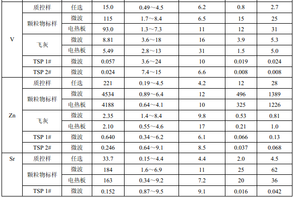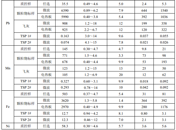 濾膜質控樣品由美國職業健康研究所提供(A-3.1)。顆粒物標樣為美國 NIST(1648a)。 樣品消解處理采用硝酸-鹽酸混合溶液(5.6),定容體積為 50.0 ml。不同類型樣品測定值濃 度(或含量)單位分別為:質控樣(μg )、顆粒物標樣(μg/g)、飛灰樣品(μg/g)和 TSP 樣品(μg/cm 2 )。其中顆粒物標樣中 Al 、Ca、K 元素含量單位為重量百分比(% )。