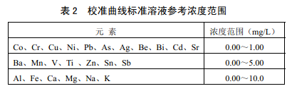 基于顆粒物樣品實際化學組成,表2 給出了標準溶液濃度參考范圍。建議在此范圍內除 標準系列空白溶液(5.9),依次加入多元素標準儲備液(5.13 )配制3 ~5個濃度水平的標準系列。各濃度點用硝酸溶液(5.9)定容至50.0 ml。可根據實際樣品中待測元素濃度情況調 整校準曲線濃度范圍。