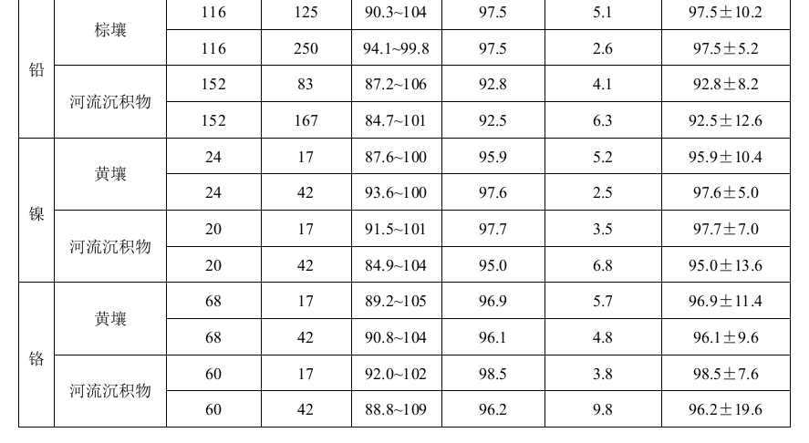 六家實(shí)驗(yàn)室分別對(duì)加標(biāo)量為17 mg/kg和42 mg/kg的含鉻為68 mg/kg的黃壤樣品進(jìn)行了6次重復(fù)測(cè)定:加標(biāo)回收率范圍分別為89.2%~105%和90.8%~104%,加標(biāo)回收率最終值分別為96.9%±11.4%和96.1%±9.6%。六家實(shí)驗(yàn)室分別對(duì)加標(biāo)量為17 mg/kg和42 mg/kg的含鉻 為60 mg/kg的河流沉積物樣品進(jìn)行了6次重復(fù)測(cè)定:加標(biāo)回收率范圍分別為92.0%~102% 和88.8%~109%,加標(biāo)回收率最終值分別為98.5%±7.6%和96.2%±19.6%。