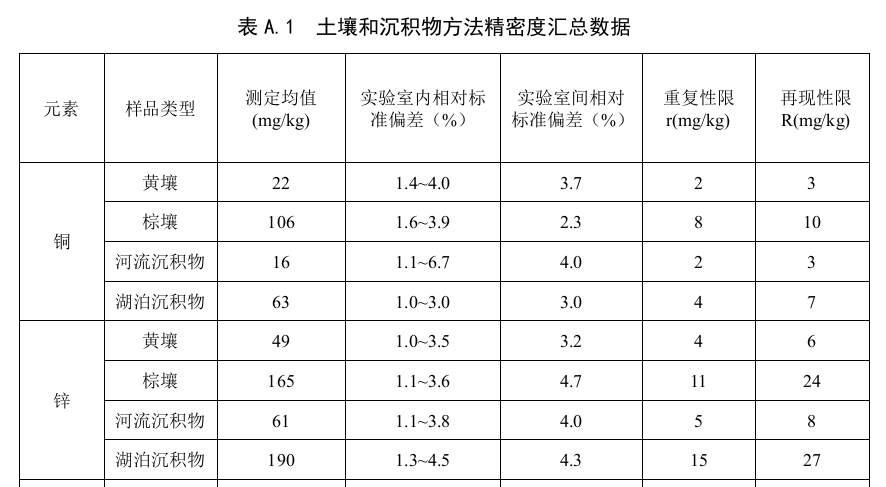 家實(shí)驗(yàn)室對(duì)不同類型的土壤和沉積物統(tǒng)一樣品進(jìn)行了測(cè)定,方法的重復(fù)性和再現(xiàn)性等精密度數(shù)據(jù)見(jiàn)表A.1。
