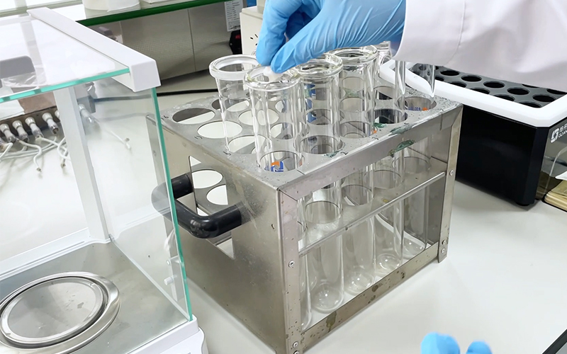 將樣品粉碎后混合均勻,稱(chēng)取2.0g(精確至0.1mg),使用稱(chēng)量紙包裹樣品,一同放入消化管中,加入混合催化劑片2片(或混合催化劑粉末3.2g),沿消化管壁加入濃硫酸15mL。