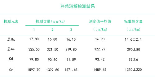 本試驗采用的石墨消解儀硝酸濕法消解方式,僅需1次前處理方法,可以同時檢測鎘、鉻、汞和砷4種重金屬元素,操作簡便,試劑耗材消耗量少,石墨消解儀消解芹菜,節約了成本,具有批處理量大且無需實驗人員值守的優點,安全性系數高,一般性實驗室均可采用。本實驗只用硝酸硝解樣品,對樣品進行預消解處理,安全系數高,樣品空白成分簡單,空白值低。