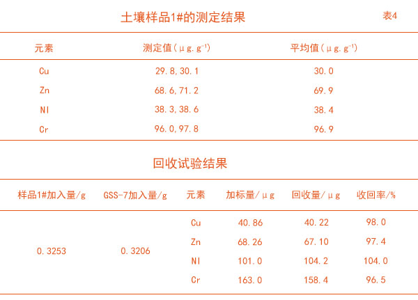 將土壤樣品1#按照消解步驟消解后進行ICP–OES測定。然后將土壤樣品1#與GSS–7質控樣以質量比1∶1左右進行加標回收試驗,測定結果見表4。從表中結出各元素回收率在96.5%~104.0%之間,滿足分析要求。