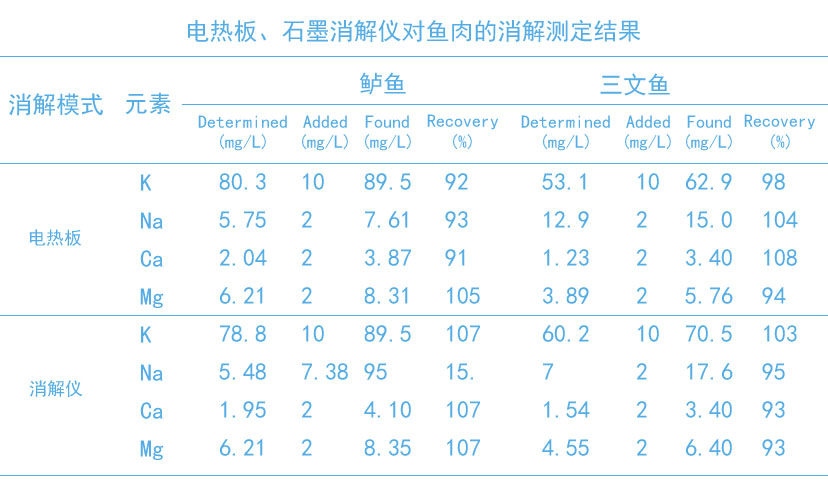 電熱板濕法全消解、石墨消解儀半消解對樣品前處理方法對鱸魚和三文魚進(jìn)行分析,結(jié)果表明上述消解方法均具有較好的精密度和準(zhǔn)確度。其中的石墨消解儀消解方法能夠更加有效、快速、綠色地測定魚肉中常見的幾種營養(yǎng)元素。