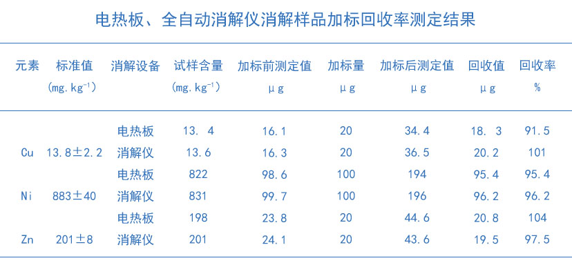 從上表結果所示:實驗電熱板消解法消解測定后的元素加標回收率在91.5%~104%,全自動石墨消解法消解樣品后加標回收率在96.2%~101%。兩種消解方法的加標回收率均在80%~120%之間表明兩種實驗消解方法都具有較好的加標回收率。且全自動石墨消解法的加標回收率優于電熱板消解法。
