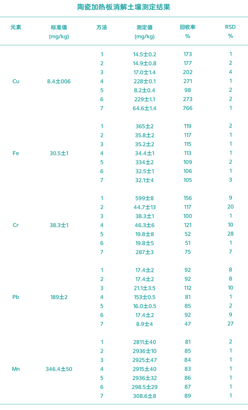 HNO3+HF+HCLO4酸體系體系的新型陶瓷加熱板消解對土樣中的各種重金屬在不同情況下有些不同的效果,加酸量的多少以及實驗加熱板溫度的控制都土壤重金屬含量的有著一定的影響。因此,在測定土壤中重金屬含量的時候使用適合的酸體系消解方法對土壤類型的測定效果有些很大的幫助。
