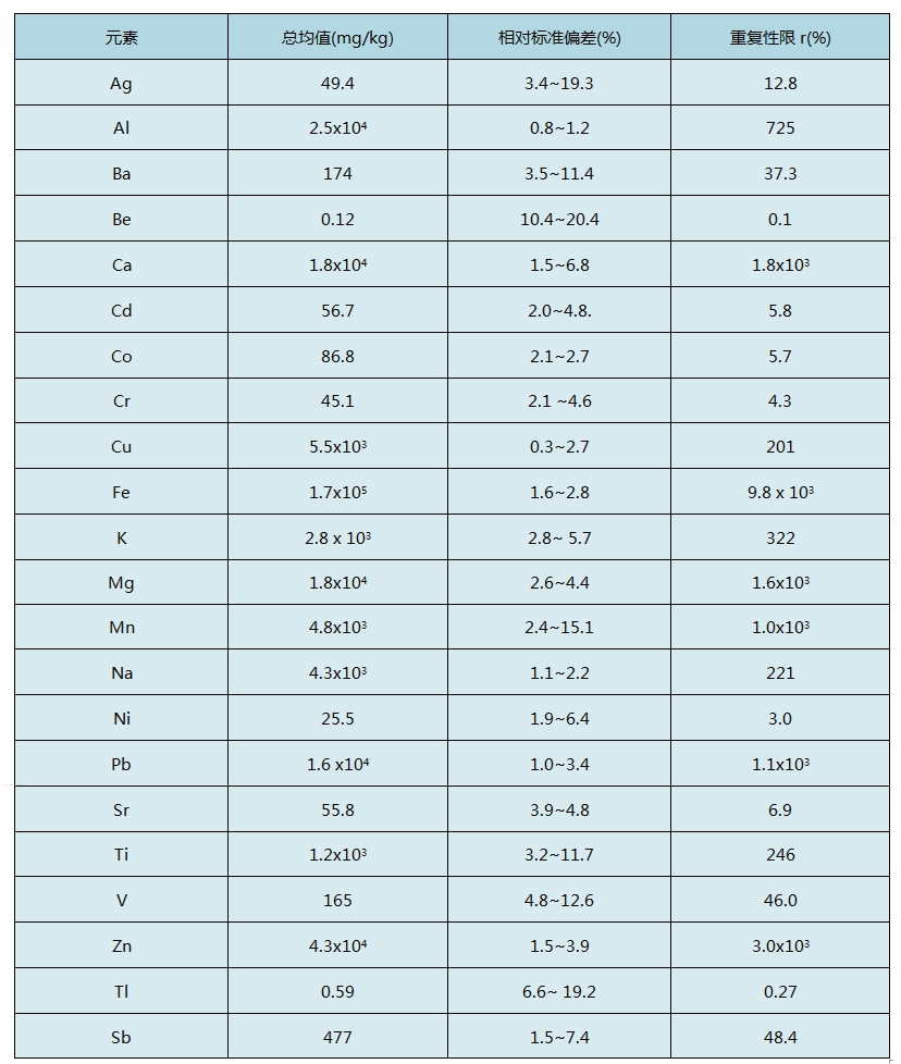 從表中看出相對標(biāo)準(zhǔn)偏差范圍分別為:1.1%~22.6%,數(shù)據(jù)可靠,符合實(shí)驗(yàn)室對固廢消解要求。