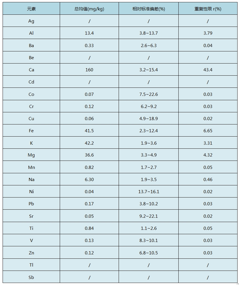 采用固廢消解步驟五中的方法對固體廢物中22種金屬元素浸提液標(biāo)準(zhǔn)樣品ISS-2樣品進(jìn)行消解,經(jīng)過6次測定分析得出精密度結(jié)果如下表: