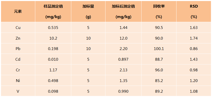 從給中可看出樣品測定精密度為0.86%-1.74%,回收率為85.2%-100.1%,滿足實驗要求,實驗室數據可靠有效,訪方法可用于其它同類樣品的消解。