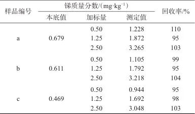 選取3種糖廠濾泥樣品,編號分別為a、b和c,分別加入低、中和高3個濃度水平的銻標(biāo)準(zhǔn)溶液,按1.4方法進行樣品處理,按照1.5方法分別測定,結(jié)果見表5。由表5可知,樣品加標(biāo)回收率為95%~110%,表明該方法具有較高的準(zhǔn)確度。